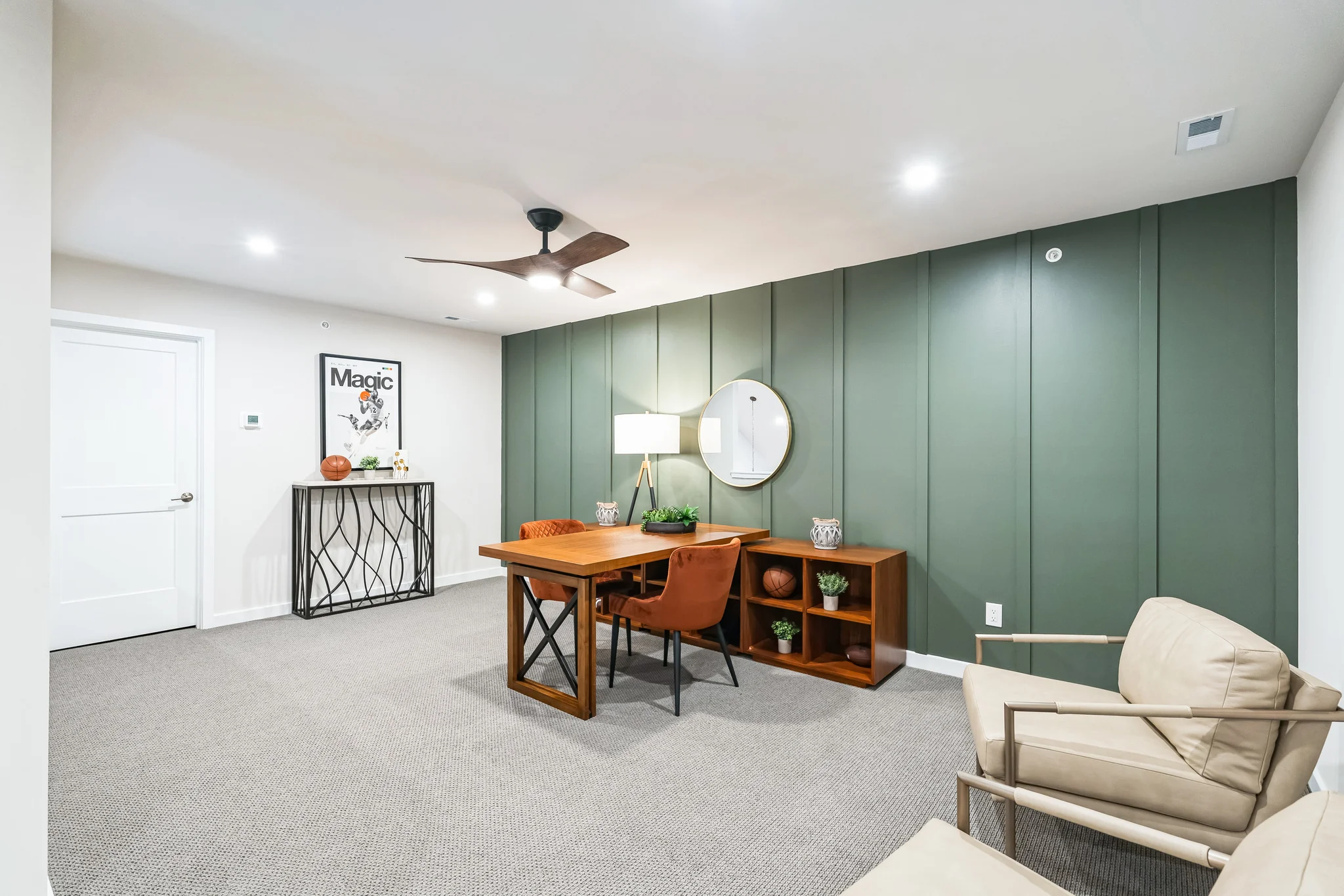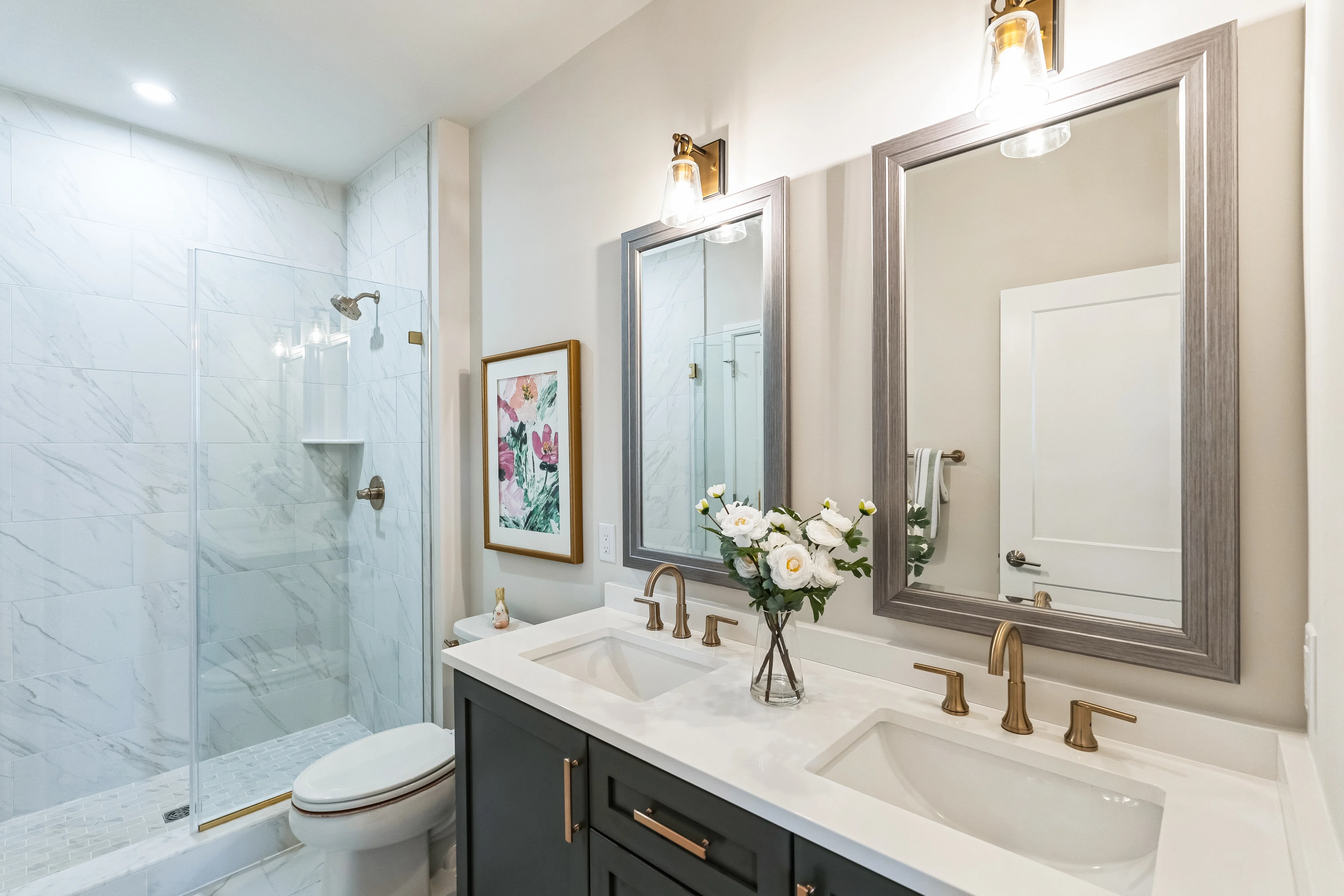 - Decorative wood-framed mirrors in all baths